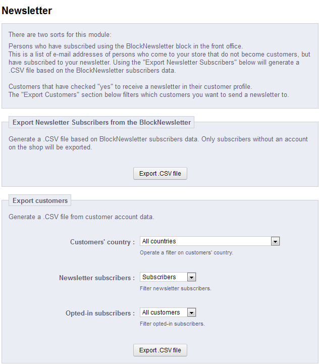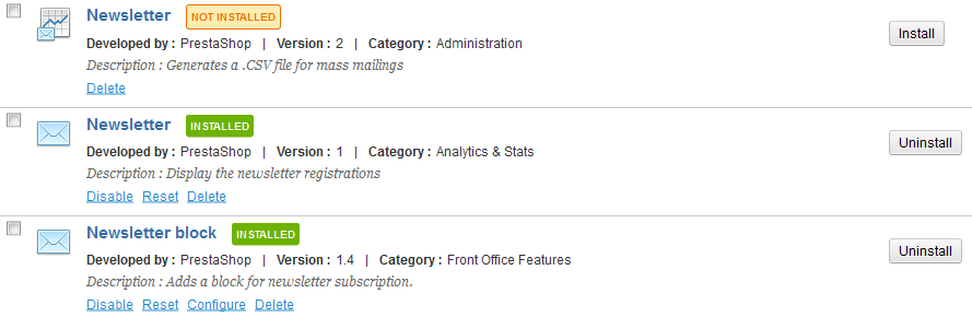 There are three newsletter modules in PrestaShop, but only one of them is not installed by default. This module allows you create a CSV file in order to send emails to many people at once. The following tutorial explains how to install the Newsletter module in PrestaShop 1.5.