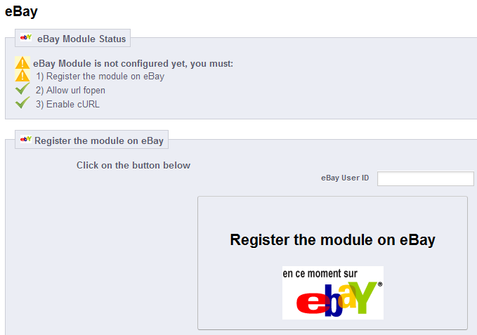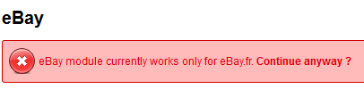 - As of this writing the EBAY module is still only operational for eBay.fr. This is the warning you will see: