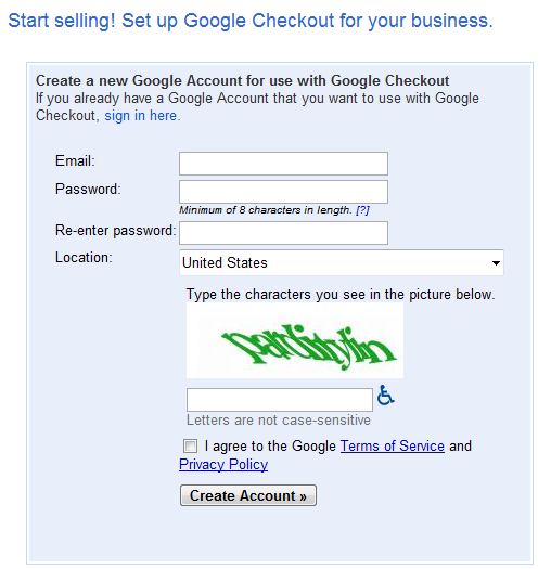 Make sure to read through the information that Google provides for the setup. The setup can be put into SANDBOX mode to test. Furthermore, note that you MUST have an account in order to use Google Checkout (the information above has been altered and is not valid, so please do not use the information in the screenshot). You can go to Google and search for "Google Checkout" for more information. If you do not have a Google account, you will have to create one and then sign up for their Checkout services. It may appear confusing as it's associated with a product called Google Wallet. Once you sign into Google, you'll see a page that invites you to setup a Google Checkout account. It may appear like the following screenshot: