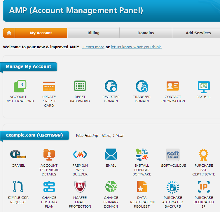 Your Account Management Panel (AMP) is used to register domains, install the Premium Web Builder, update your billing information, and more. All web hosting accounts include your own AMP, however you must set up your AMP account login by visiting the link in your "Welcome to Web Hosting Hub" email.
