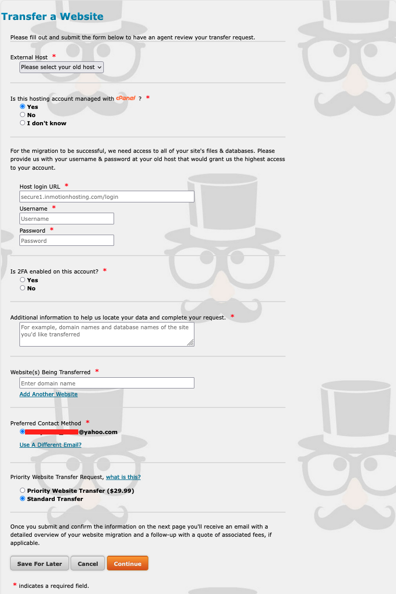| Is 2FA enabled on this account? | This question is to determine if your hosting account has two-factor authentication enabled. This generally involves the use of a connected device to verify login attempts. In the event of a website transfer, you will want to temporarily disable this functionality to allow our technicians to access your data. Once you have entered all the data, click the Continue button. If you selected an external transfer, you will first need to input the following information: |