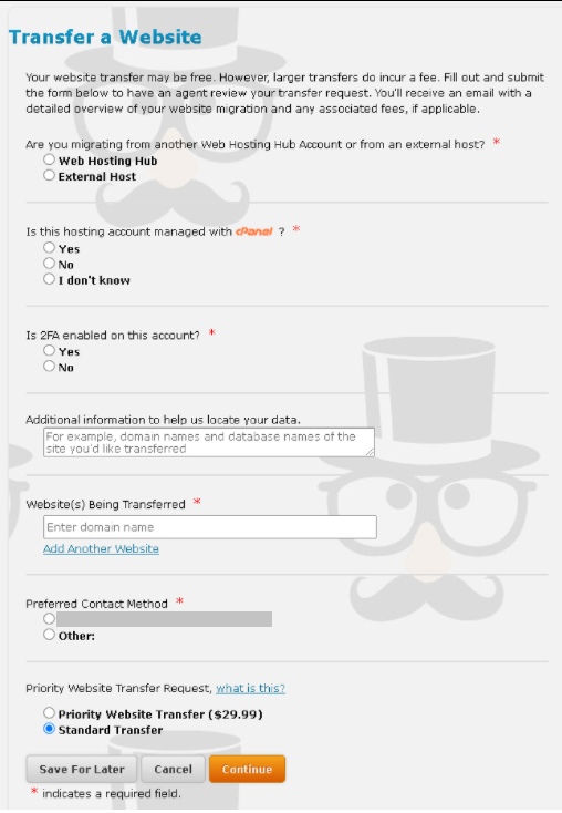 | Identify the hosting provider! | This is to determine if you are transferring your data from one Web Hosting Hub account to another or from a separate hosting provider entirely. Process and fees may apply when transferring data from one Web Hosting Hub account to another. |