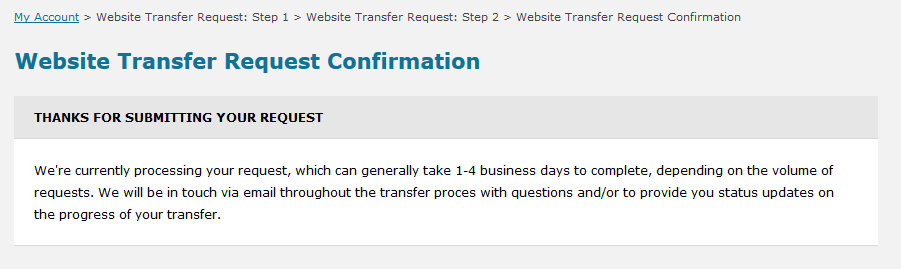 The last screen you see is the confirmation screen. This means your website transfer request has been sent to the Support team and will be worked ASAP. The normal process for a website transfer may take up to 14 days to complete. If you paid for expedited service, you can expect a faster time frame. You will receive an email from the team as soon as the transfer is completed.