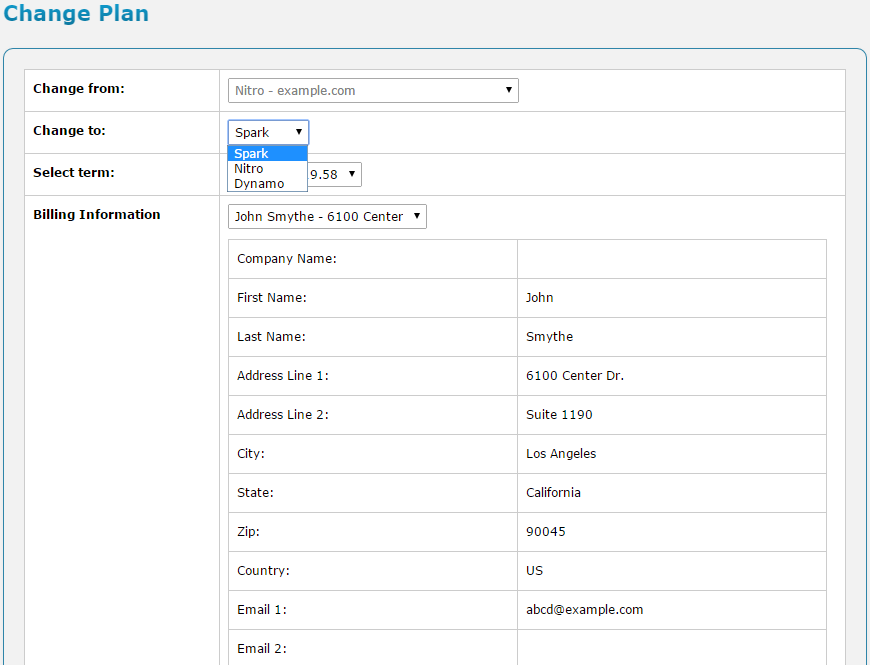 On the Change Plan page, you will see your current plan listed at the top. Click on the Change to drop-down menu to select your new plan: Spark, Nitro, or Dynamo.