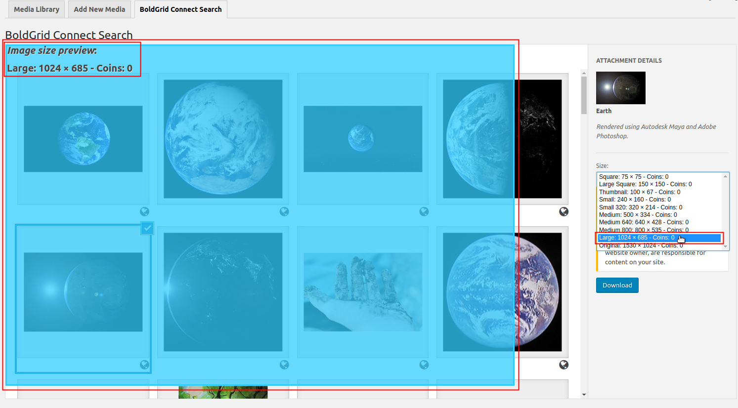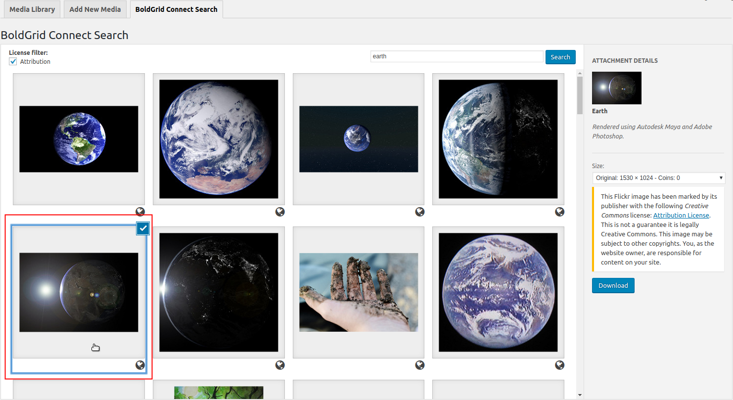 If you need to find a particular picture for your website, then using the BoldGrid Connect Search to find images is one solution that is immediately available to you through the BoldGrid Administrative interface. You can see the option to search in the Media Library in the BoldGrid Administrative Dashboard. The following tutorial shows you how to use the search feature to find images to download.