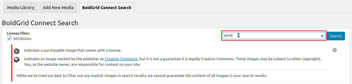 Some important notes about using BoldGrid Connect Search. When you start the search you will be given the following warning: While we've tried our best to filter out any explicit images in search results, we cannot guarantee the content of all images in your search results. This means that it is possible that some of the content shown in the search results may be explicit.