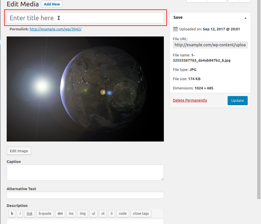 Now you are redirected to the Edit Media editor. You can name your image and also append additional information by scrolling down and entering the fields as desired. Name your image, by typing it into the "Enter title here" field.
