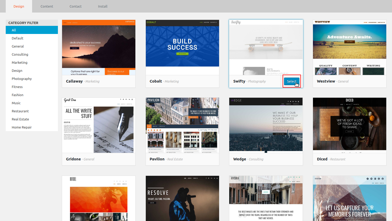 You can scroll to browse the many Inspirations available to install. You can also click on an Inspiration to view a larger preview. Either way, once you find your favorite one, click on the Select button to proceed.