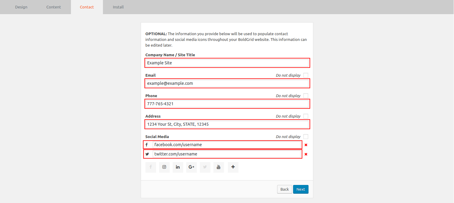 Modify the fields under the Contact tab to customize your website's information. Click Next to proceed.