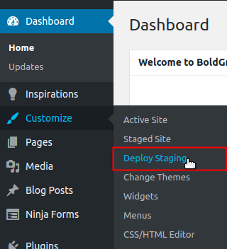Hover over Customize in the menu to the left, then click on Deploy Staging.