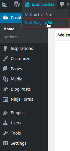 Simply hover over the website title (ie: Example Site) in the Administrative Menu at the top. Then click on Visit Staging Site. This will open up the Staging site so that you can view your website's new appearance.