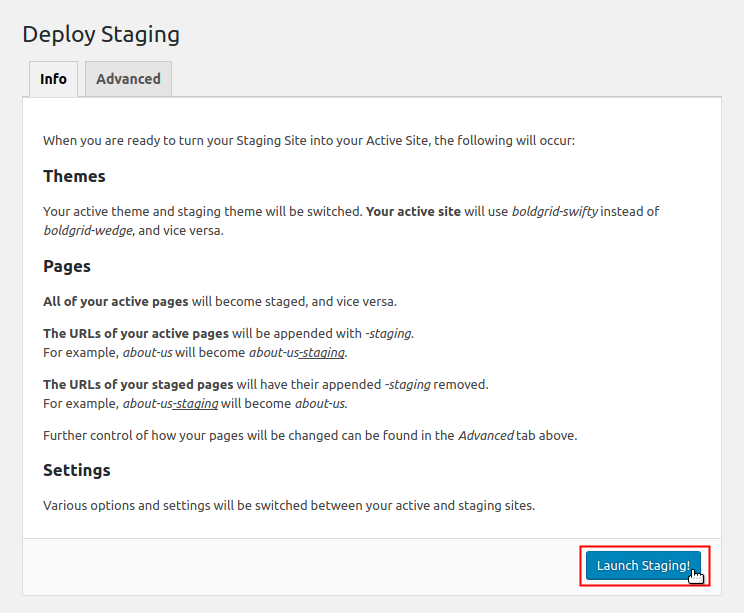 Once you have installed, modified, and previewed your Staging site, it's time to deploy it. Deploying your Staging site will launch the Staging version of your website and take down your Active site. Follow the steps below to deploy your Staging site with basic options.