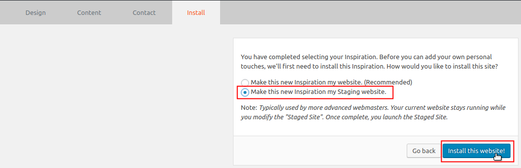 Select the radio button next to the option Make this new Inspiration my Staging website. Click Install this website!.