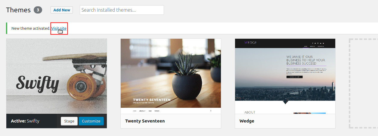 With your favorite theme installed, hover over it and click the Activate button. This will change your active site's theme. Once the theme you selected is activated, you will see a success message. Click the "Visit site" link to view your website's new look!