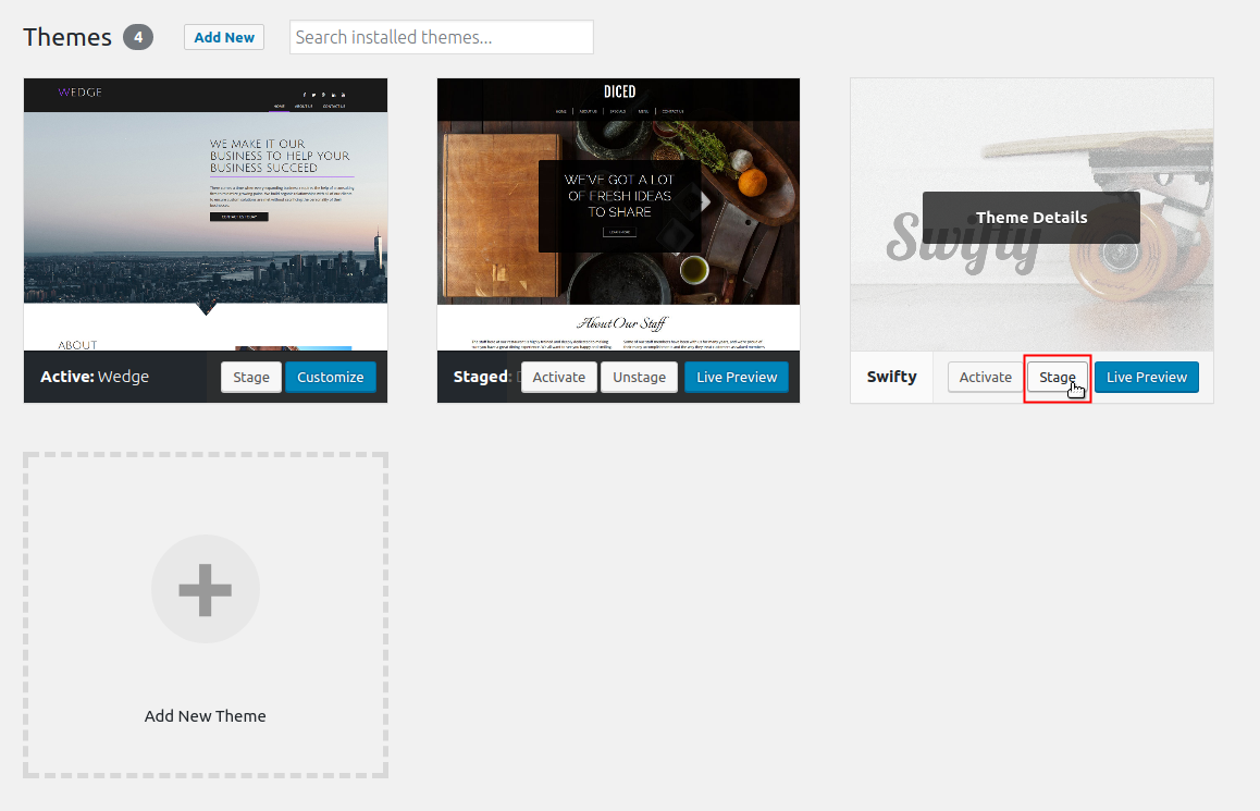 If you do NOT already have your favorite theme added, you simply need to add a new theme. You can refer to the section titled: "How to Change Your Active Site's Theme" for more help. Otherwise, hover over your favorite theme and click on the Stage button.