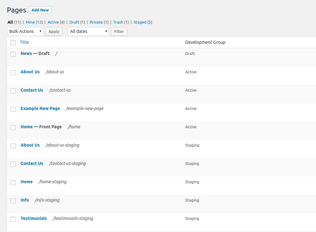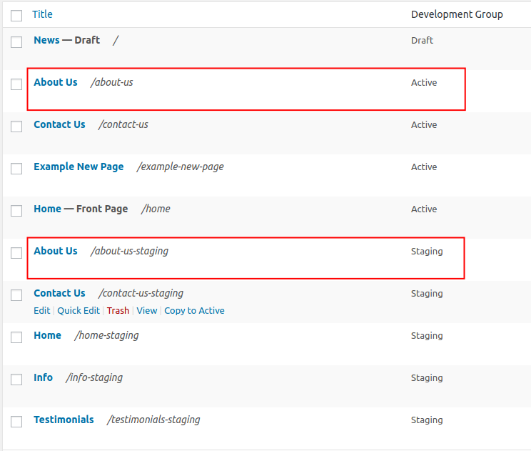 Pages can be published to either your Active or Staging site and will be visible when viewing those locations. The other group types indicated in the Development Group column include Active and Staging.