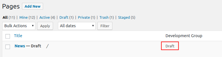 When you create a draft of a page and save it, you will see the article labeled as Draft in the Development Groups column on the screen listing all of the pages. Pages saved as drafts are not published and will not be seen on the site.