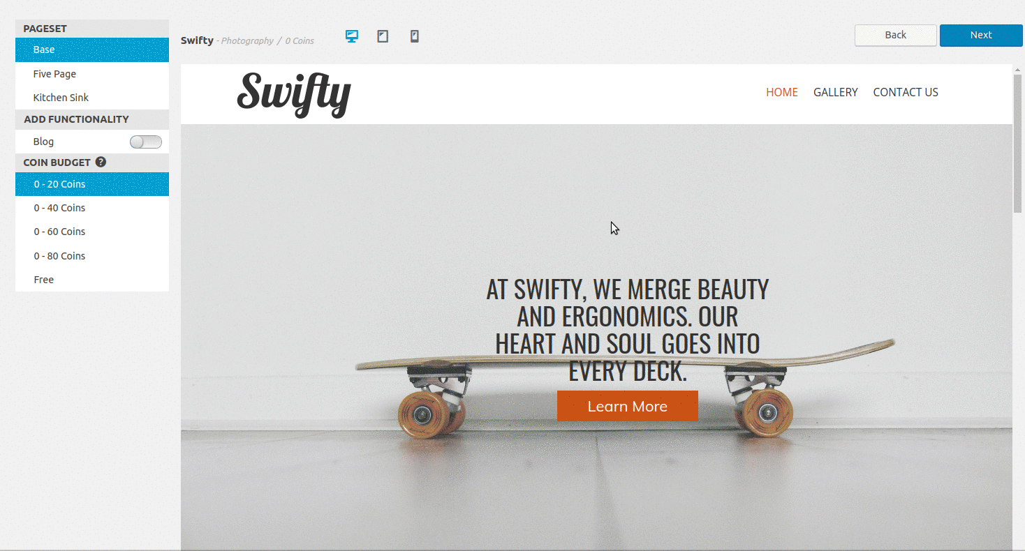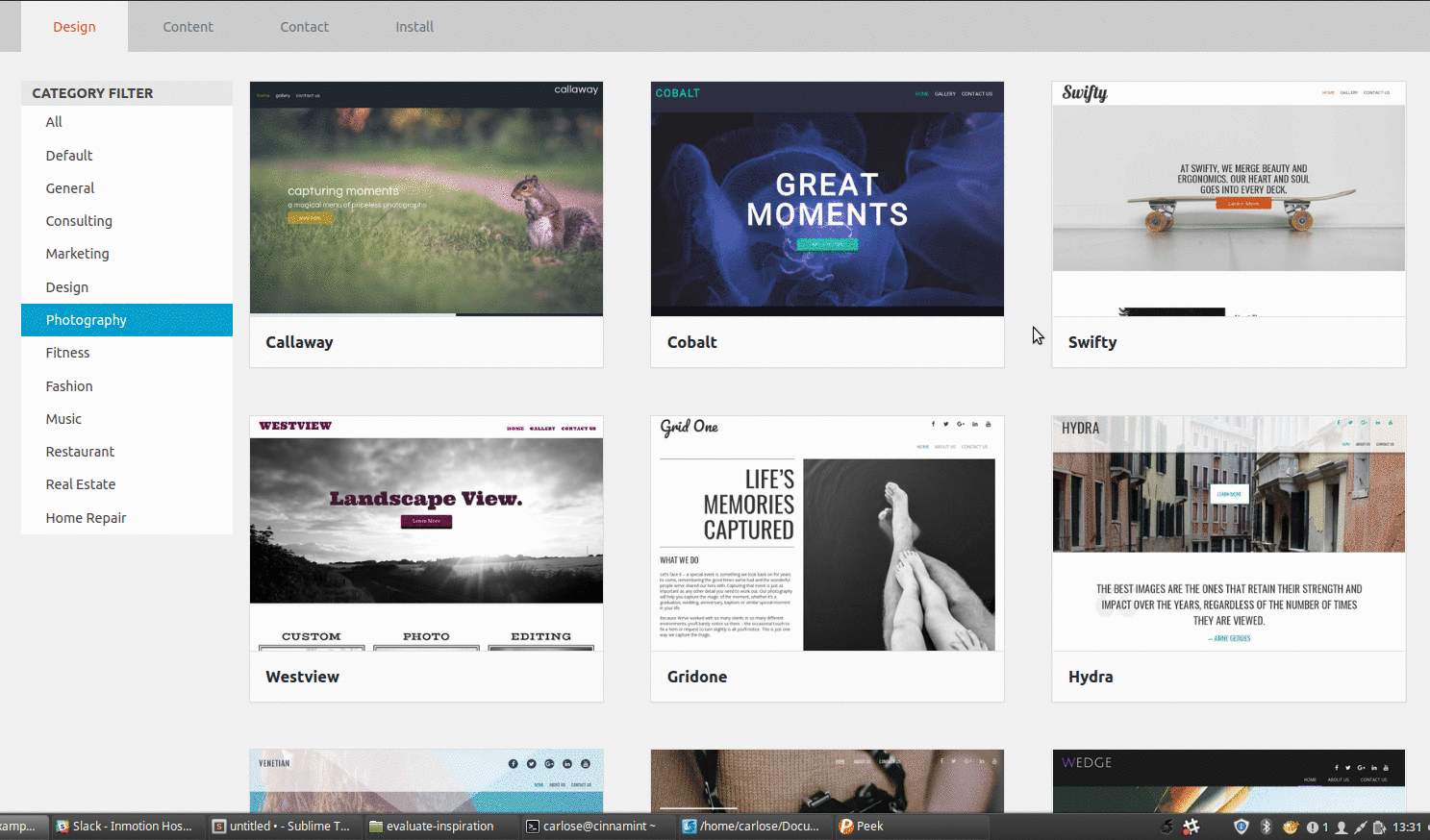 You do not have to commit to an Inspiration immediately. Click the Select button for an example of one you like, so you can continue to follow the rest of the steps in this guide. You may return to the Design tab, to select another Inspiration to evaluate, as often as you need. Again, the simplicity is that you do not need to install a whole website, just to review the content. For our example, we will choose the Swifty - Photography Inspiration.