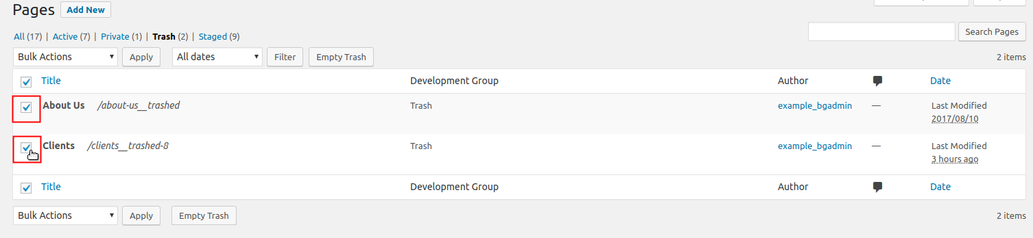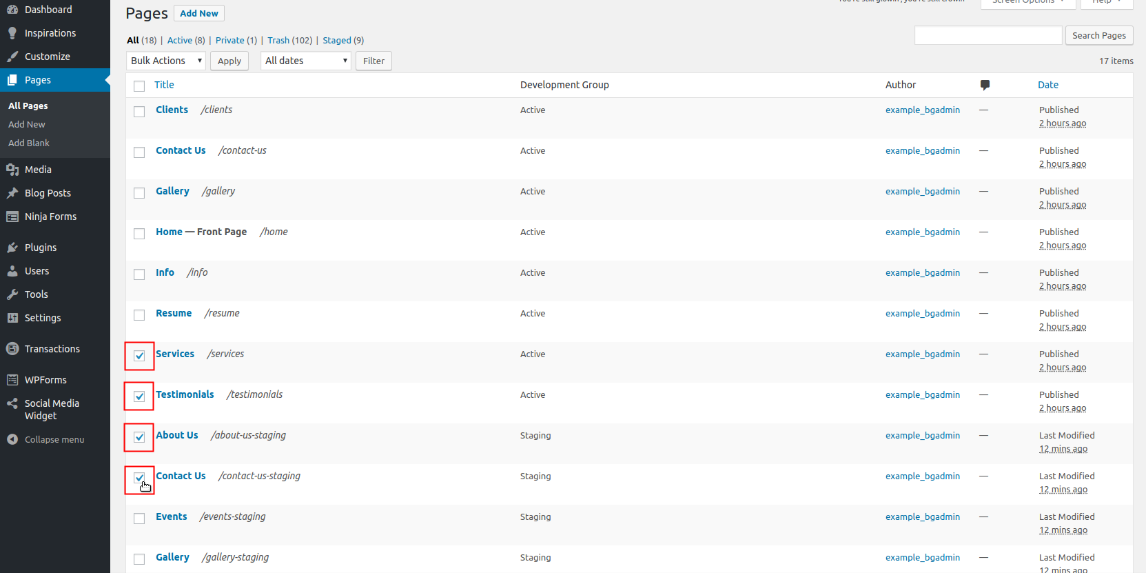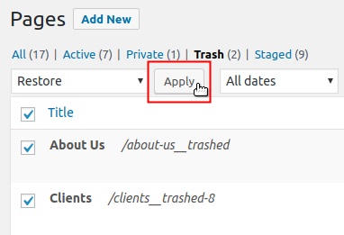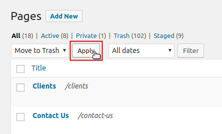 Using the Bulk Actions options, you can select multiple pages to delete at once. Follow the instructions below to bulk delete pages from your Active/Staging site.