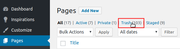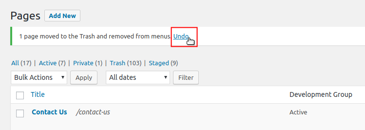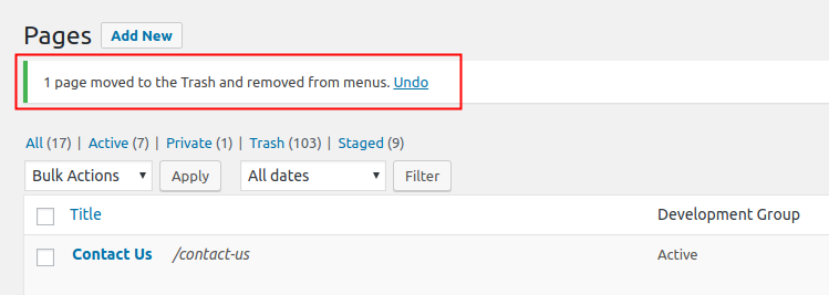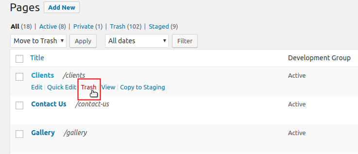 Removing pages in BoldGrid is exactly the same as removing pages within a typical WordPress site. The main difference is that you must be cautious in choosing the correct Development Group for the page that you are removing. The steps described below show how to delete pages from your BoldGrid site which includes the Active and Staging locations.
