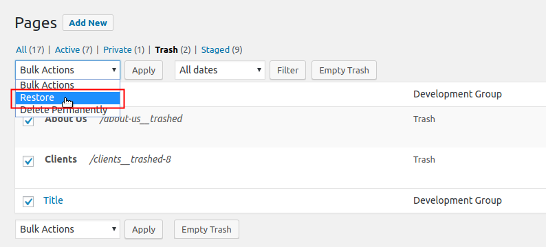 Once you have selected all the pages you want to restore, click the Bulk Actions drop-down arrow. Then click on Restore.