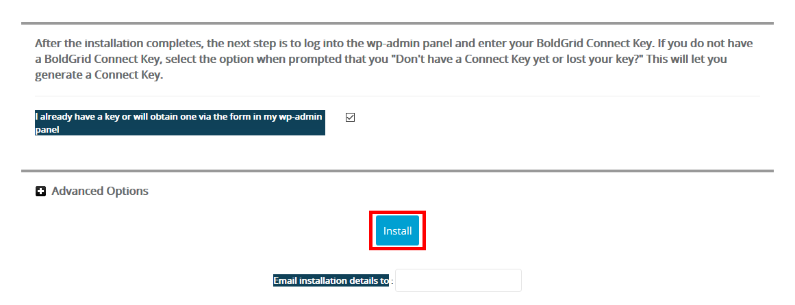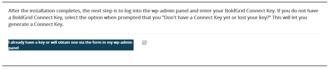Check the box if you already have a BoldGrid key one or will be getting one in the WordPress admin dashboard.