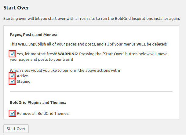 From the BoldGrid Settings page, scroll until you find the Start Over section. Then select every checkbox in that area.
