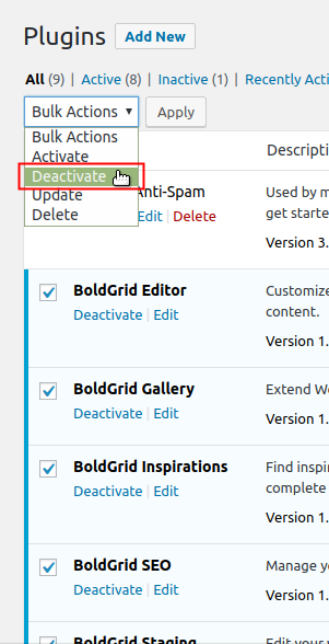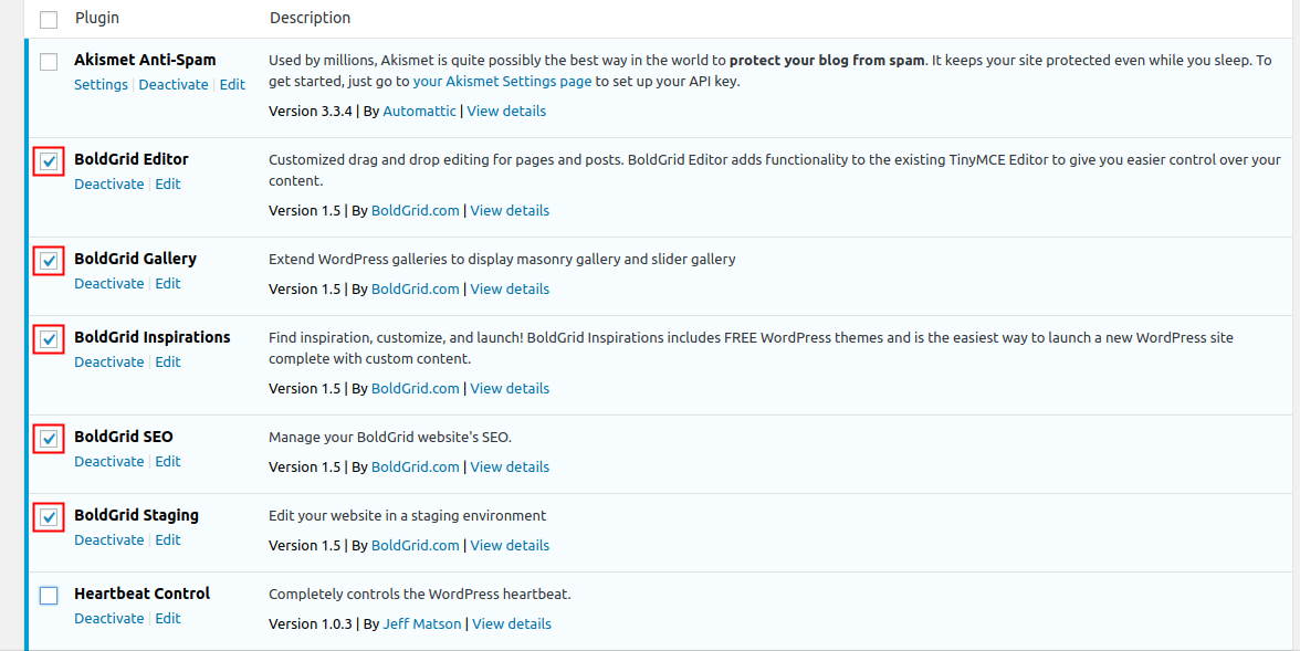After they are disabled, select checkboxes for each BoldGrid plugin again.