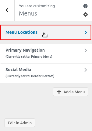 Here you will see the different menu locations available for your Inspiration. Each location has a drop down menu where you can select the defined menu to be displayed. Here you see the Social Media menu is already set in the Header Bottom location. If you want to select a menu you have created, click on the drop-arrow to select your menu.