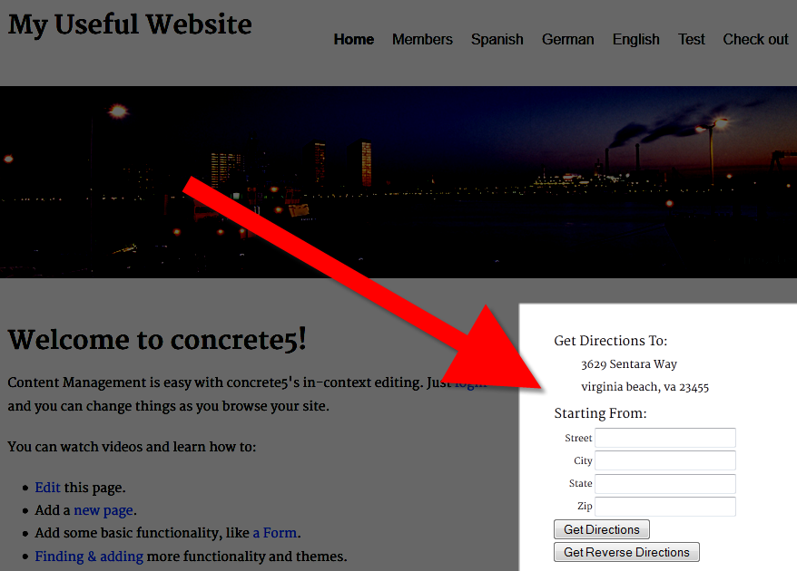 Congratulations, now you know how to provide directions to a specific location using the free Get Directions add-on available in the Concrete5 Marketplace.