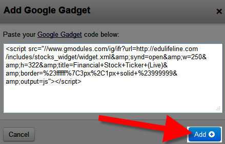 - On the Add Google Gadget menu, enter your google gadget code, then click the blue Add+ button on the bottom right. In my test I am adding a stock ticker.