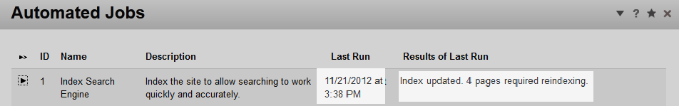 - To the left of the item named Index Search Engine, click the play arrow to index your search engine. It may take some time to complete this step.