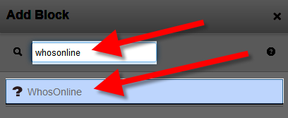 - Select the +Add Block option and scroll down and select, or search and click the WhosOnline block on the list.