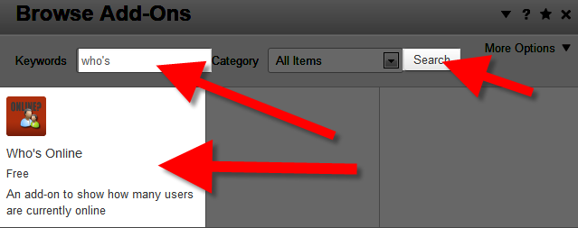 - In the Keywords field type 'who's online' then select the Search button to the right. Click the free Who's Online add-on that is listed.
