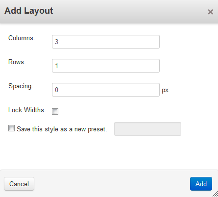 - On the Add Layout menu, choose how many Columns and Rows you want, and whether you want spacing between them (enter a number in pixels). If the Lock Width option is not checked, you can adjust the width of the layout after you have set it up. In my tests I used the default settings of 3 columns, 1 row, 0 pixels for spacing. I did not lock the widths or save the style as a preset.