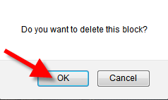 This will bring up a confirmation message, click okay to confirm deletion, or cancel to keep the block.