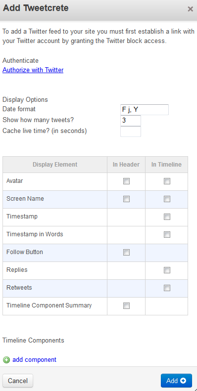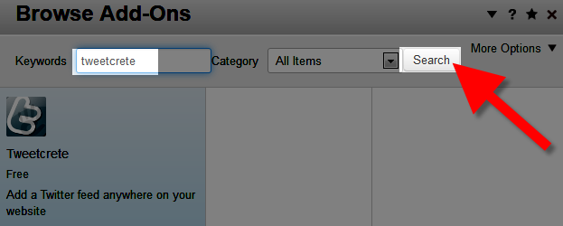- Search and select, or scroll down and click the Tweetcrete Add-on. The Add Tweetcrete menu will present several options: