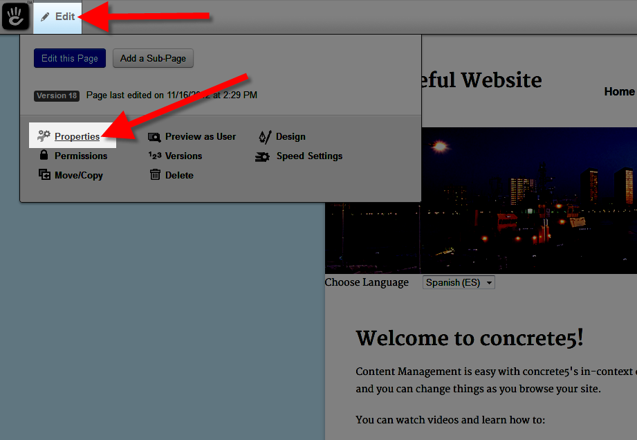 - Roll your mouse over the Edit button on the top left of the page, choose Properties from the menu.