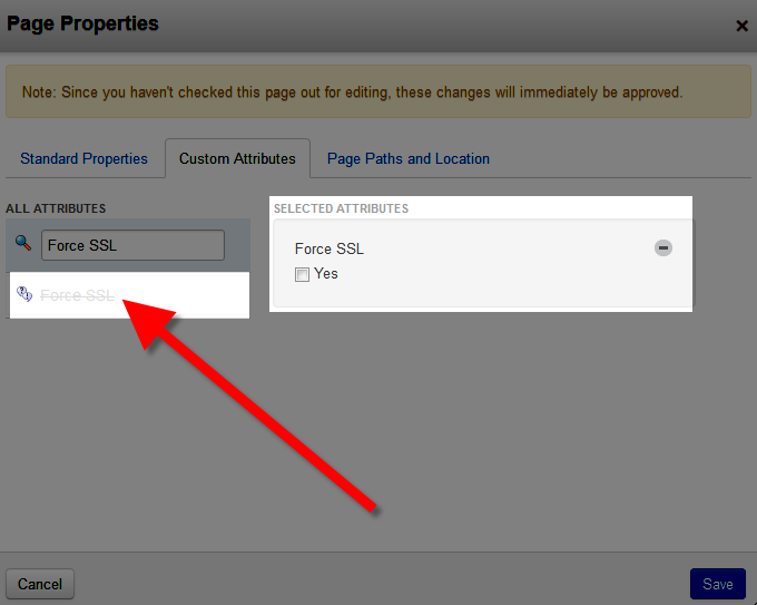 - Search, or scroll down the list and click the Force SSL option, it will then be listed under the Selected Attributes section.