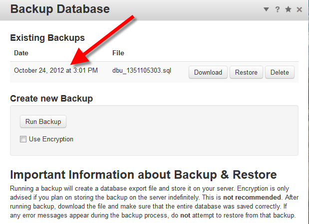 - On the Backup Database menu, click the Run Backup button to perform a backup. There is an option to Use Encryption, but Concrete5 does not recommend using this option unless you plan on storing this backup on the server indefinitely. Concrete5 also warns not to use the backup if an error occurs during the process.