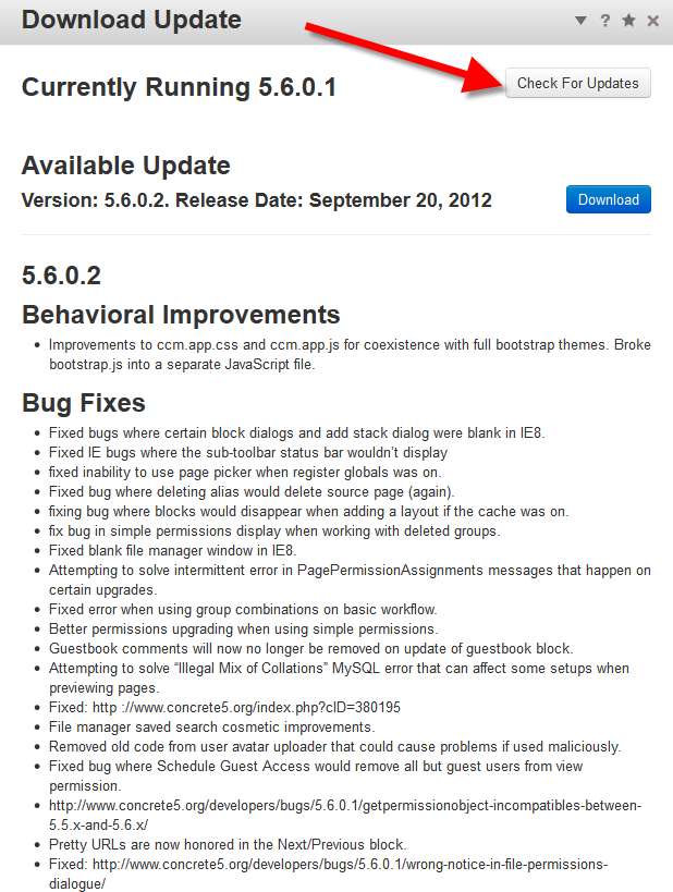 - It will list your current Concrete5 version, and available updates. You can also click the Check for Updates button to look for updates. Take note that it lists Behavioral Improvements, as well as Bug Fixes included in the update. This is so that you are made aware ahead of time, as to what is going to be affected when you perform the update.