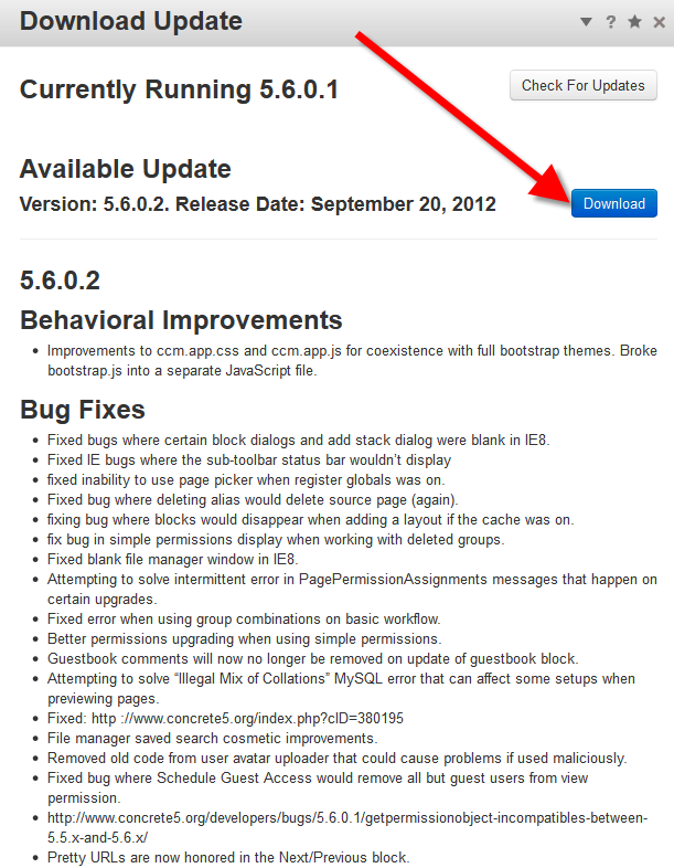 - Check for available updates in the concrete5 Dashboard.
