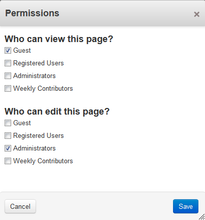 Select the check box next to the groups you want to View / Edit this page. Keep in mind the Guest group is any visitor to your website, so be careful if allowing this group to modify a page. Registered Users are required to create an account.
