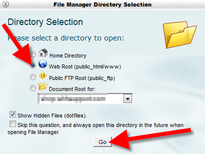 If the file manager directory selection come up, select Web Root as the directory to open, then click the Go button on the bottom. This will bring up the File manager.
