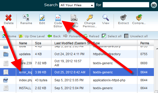 - On the right side of the File manager, select the error_log file, then click the Code Editor button on top. This will bring up the Code Editor menu, click the Edit button on the bottom to continue to the code Editor.