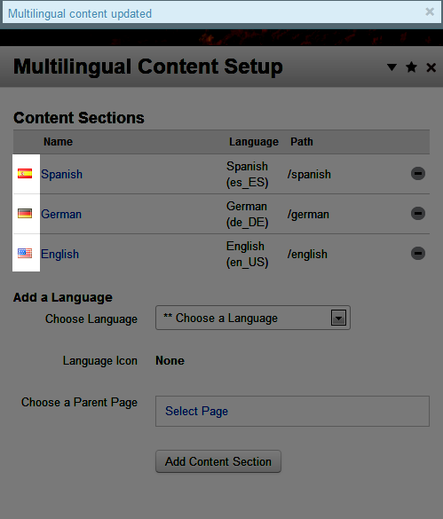 You will see images of the flags next to the site that was setup, and a mesage that states Multilingual content updated. Repeat, steps 6-9 for each language page.