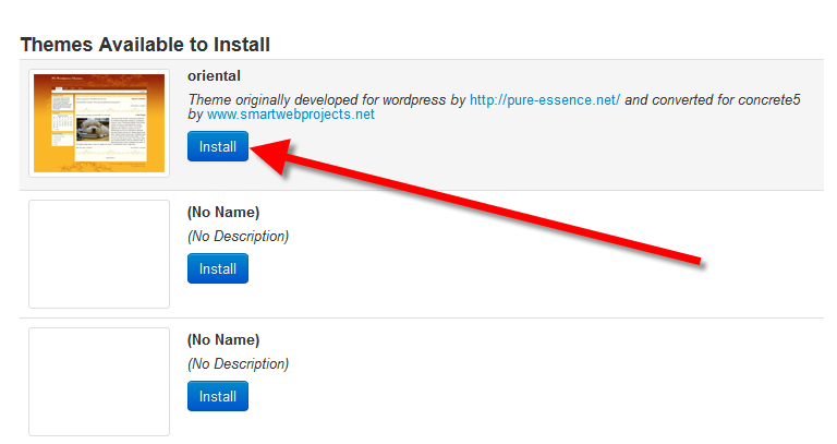 - You will now see the theme listed under Themes Available to Install, click the blue Install button next to the theme. In my tests I am installing a theme titled oriental.
