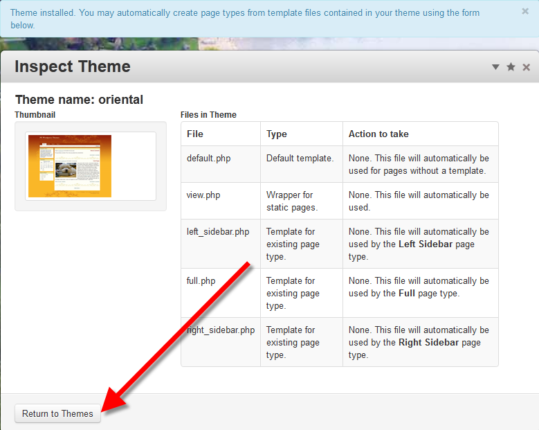 This will bring up a Theme installed message, and list the theme files under the Inspect Theme menu. Click the Return to Themes button on the bottom left.