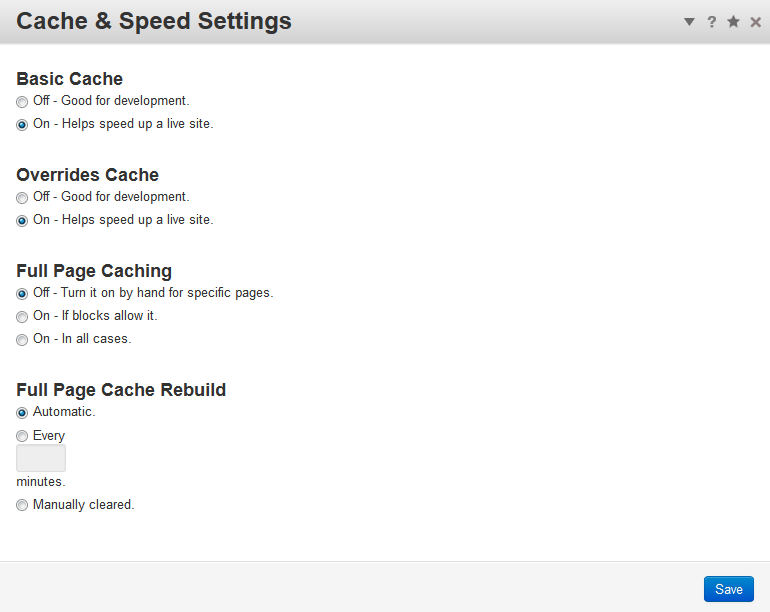 | Full Page Cache Rebuild | You can set how often the full page cache is rebuilt and saved. Automatic will clear cache based on concrete5's default settings. You can also set it in minutes, or manual. |