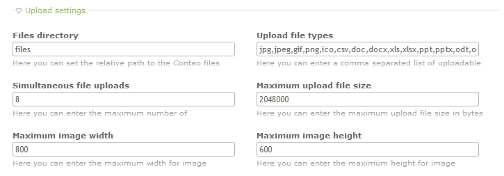 This will change the size of the files allowed to be uploaded through the File Manager and the Contao File Manager. Bear in mind that while file sizes can be used, the acutal size used should be limited per your server performance needs. You do not want to be loading 16 MB graphic files, and expecting the performance of the server to optimal at that poin. Keep the file sizes small and there should be no issues with the File Upload sizes.